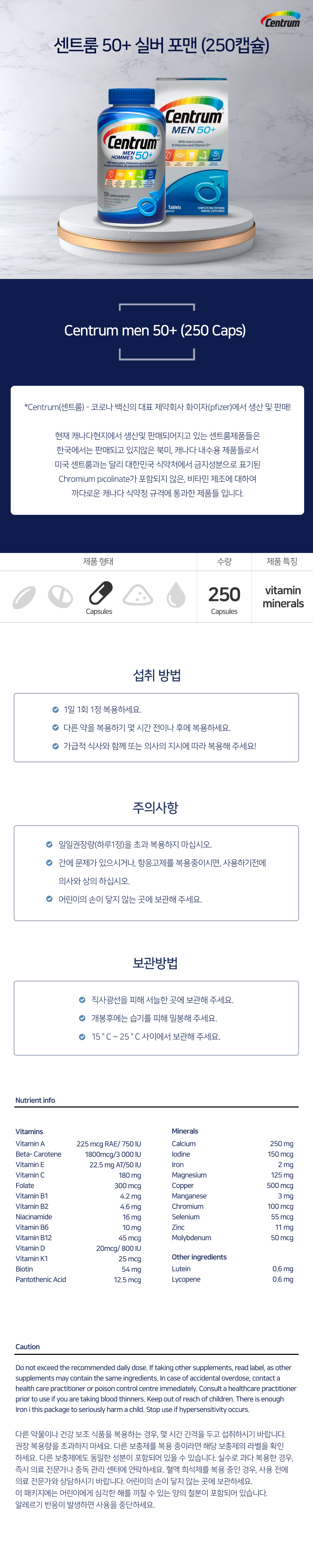센트룸 캐나다 내수용 100% 정품 250정 대용량 50+ 실버 포맨 남성 종합 멀티비타민